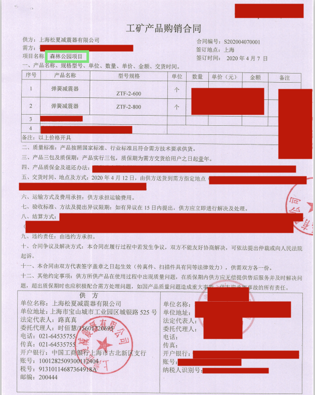 上海松夏減震器有限公司官方網站為您介紹:【福州森林公園項目】使用ZTF型彈簧減震器采購合同信息,我們松夏公司2020年為【福州森林公園項目】使用ZTF型彈簧減震器,起到了減震和降噪的作用,以下是【福州森林公園項目】使用ZTF型彈簧減震器采購合同介紹。